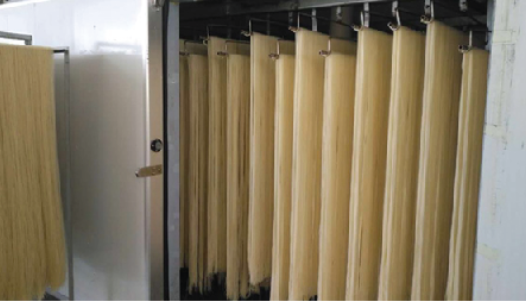 米粉的干燥工藝主要分自然晾曬干燥和烘烤干燥。老化后的米粉凝固較緊,因此在干燥前需用清水清洗,梳理整齊后放入烘烤架上烘烤。烘烤干燥要有專業的烘烤線,整個烘烤過程都在室內進行,并通過傳送帶流動烘干,烘烤間主要劃分成三個溫區:低溫區、高溫區和冷卻區間。