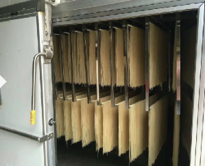米粉如果放置形式為掛起來的,對風路有影響,需要加裝軌道電機來使風量和熱量更均均。否則,容易出現風路前面的過干,而風路尾端又還沒有干的情況。烘干過程中,宜以低溫大風量為合適。過高的溫度,極容易出現斷粉。風量不夠,傳熱不均,也是另外一個很重要的問題。另外,烘干后不要馬上拉出來,烘干房內外溫差過大,極容易造成米粉卷曲變形,造成外觀缺陷。