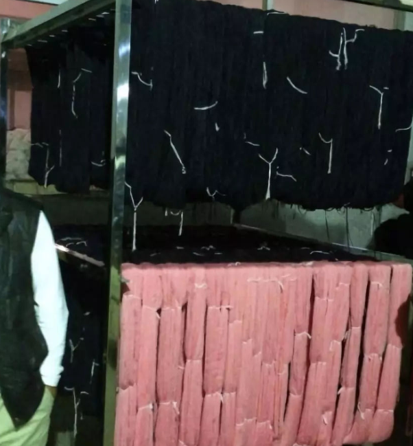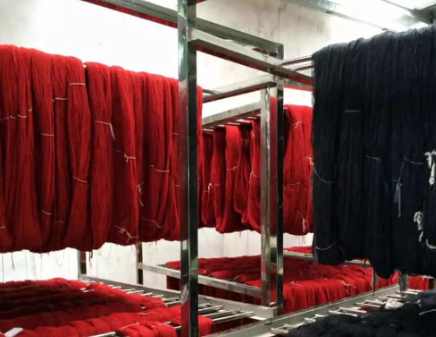 2:一車間的大姐非常認(rèn)真把紗線均勻的掛在不銹鋼的物料架上,她說,今天還有很多批紗線將陸續(xù)染好顏色,等待烘干出貨。