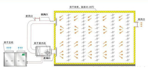 通過壓縮機做功,驅動管路中的傳熱工質吸收外界環(huán)境中的熱量(空氣中的熱量)在進行壓縮做工使其變成高溫高壓氣體,再通過換熱裝置將熱量釋放到烘干房內,通過熱風循環(huán)系統(tǒng)進行不斷烘干的過程。